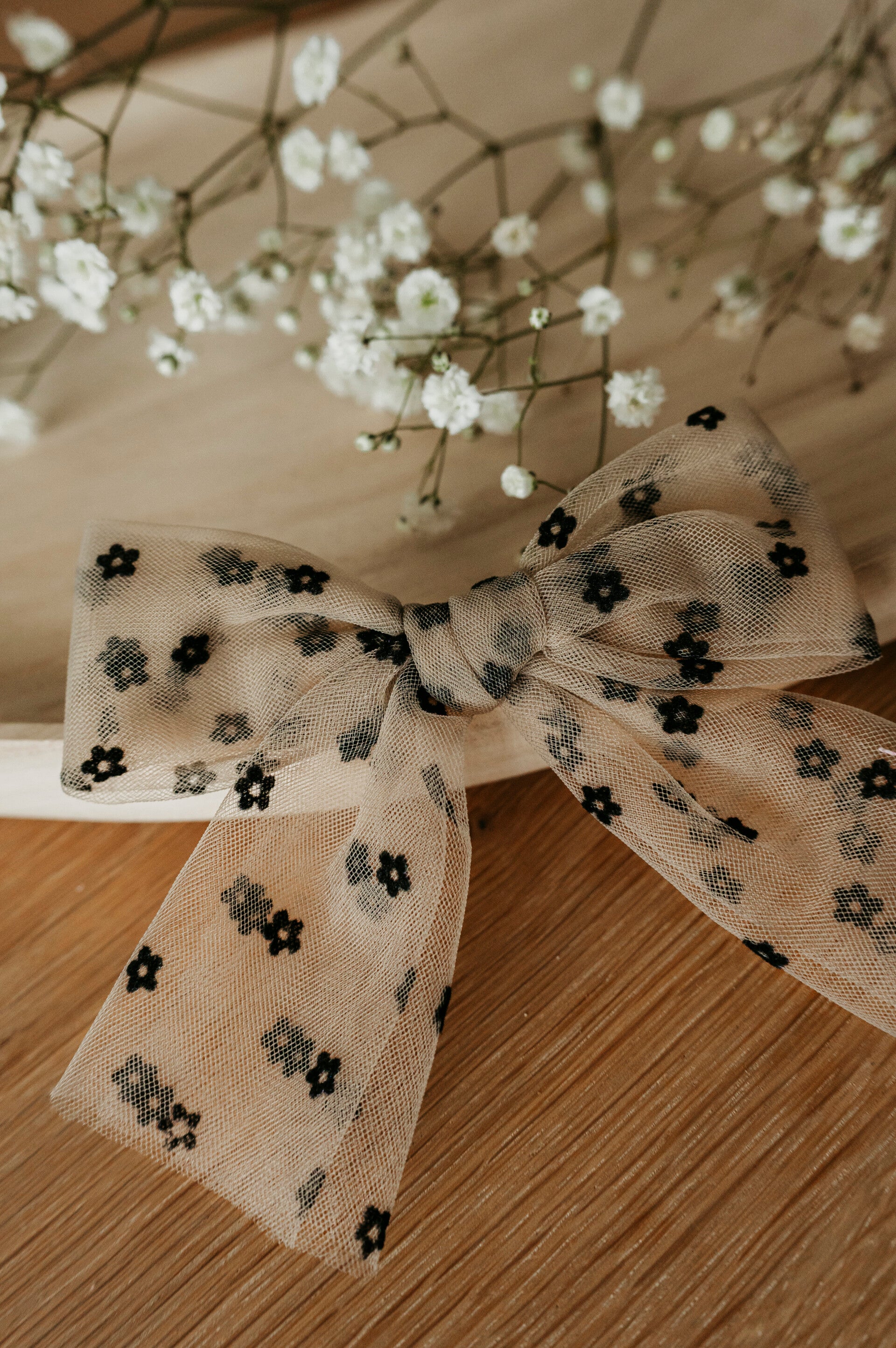 Een lichte tule strik vol fluwelen hartjes of bloemetjesm. Lief, luchtig en klaar om harten te stelen