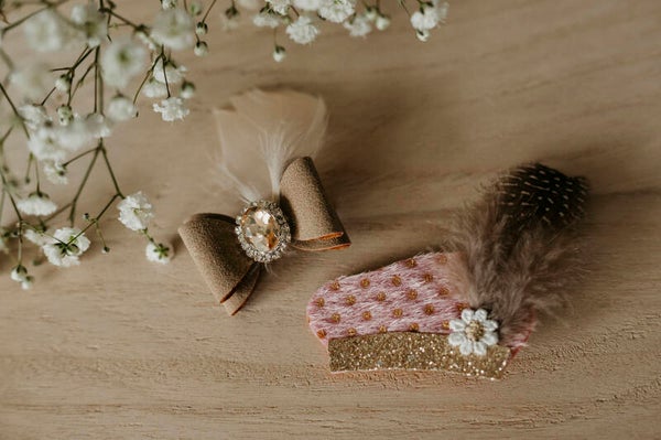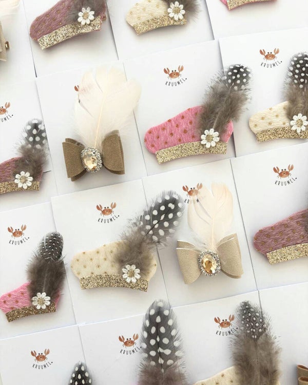 Een stijlvolle Pietenstrik van zachte faux suède in beige of taupe. Afgewerkt met een sierlijke steen en speelse veer – perfect voor een feestelijk kapsel tijdens de intocht of pakjesavond.