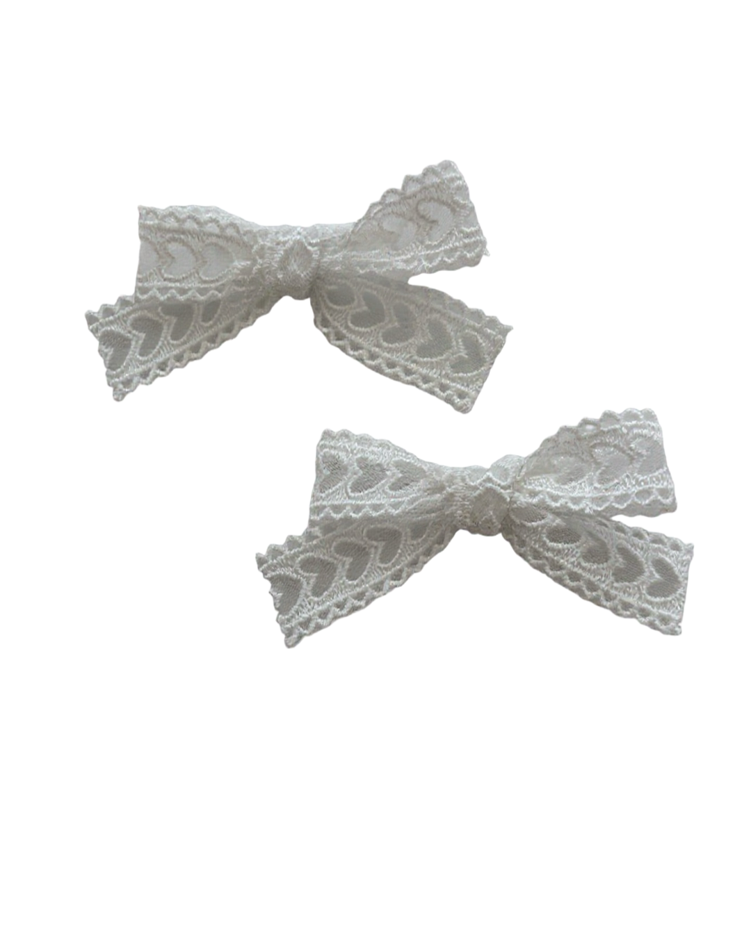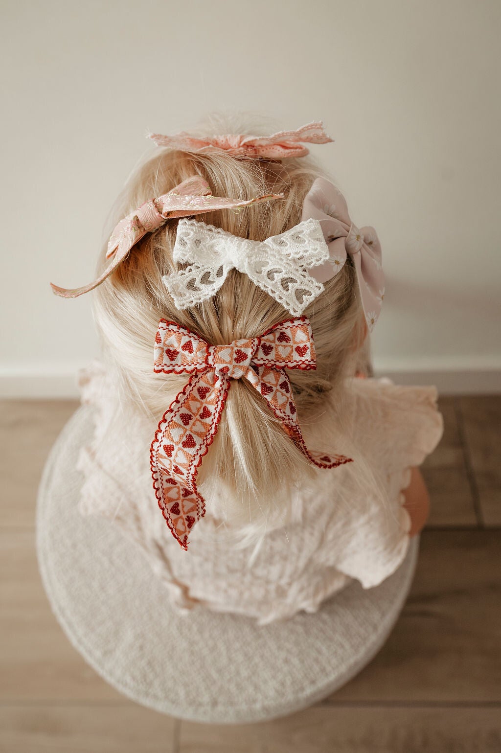 Bij 2 strikjes worden de strikjes gespiegeld bevestigd op een alligator speldje