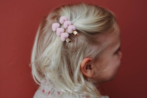 Deze lieve speldjes zijn gemaakt van zacht lichtroze rib en zijn verkrijgbaar in 3, 4,5 en 5,5 cm.Perfect voor staartjes, dotjes of kleine vlechtjes – ideaal voor elke dag!