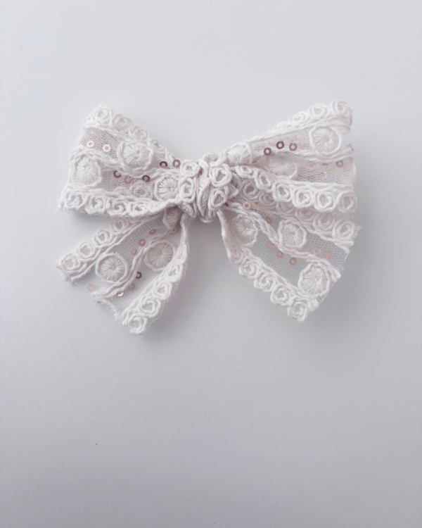 Deze prachtige beige geborduurde strik is een echte eyecatcher. De strik is afgewerkt met verfijnde borduurdetails en kleine gouden pailletjes, die zorgen voor een subtiele en elegante glans. Een stijlvol accessoire dat elk kapsel direct een luxe uitstraling geeft.