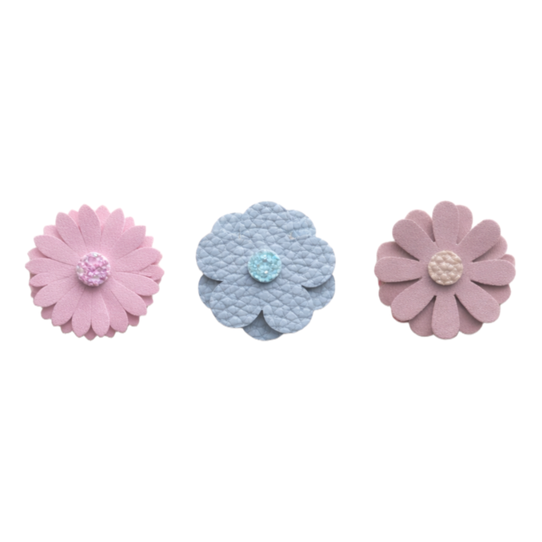 Deze lieve set van drie bloemen haarspeldjes is perfect voor kleine meiden. De speldjes zijn gemaakt van zacht (imitatie)leer in mooie pastelkleuren: roze, lichtblauw en oudroze/bruin. In het midden van elk bloemetje zit een schattig detail dat zorgt voor een speelse en stijlvolle uitstraling.
