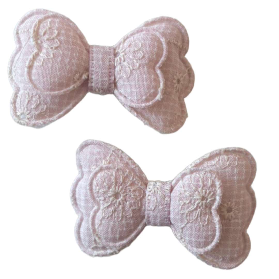 Een vrolijk lichtroze strikje met een fijn ruitje en een schattig randje kant. Speels en net even anders. Deze set van 2 zit op 4 cm alligator speldjes